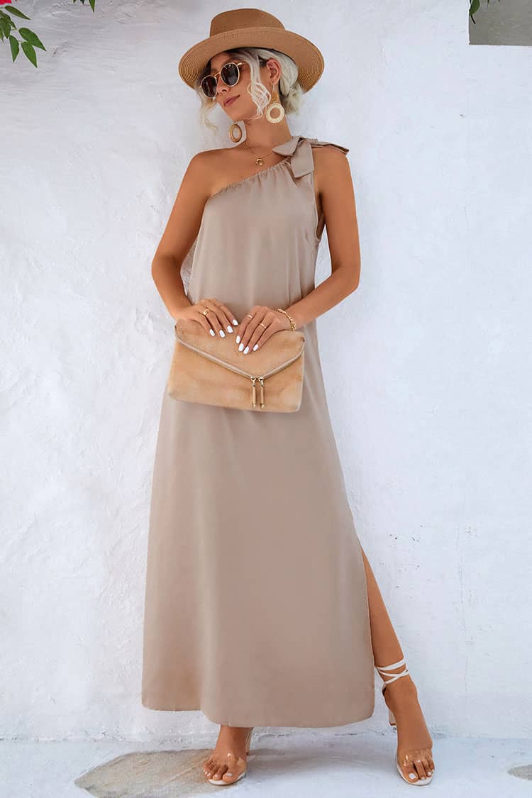 En plus, la couleur beige de cette longue robe trapèze en fait une pièce de prêt-à-porter polyvalente et intemporelle.